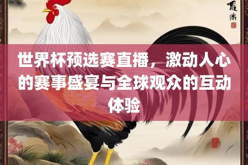世界杯预选赛直播是一场激动人心的赛事盛宴与全球观众的互动体验,通过直播,观众们可以随时随地观看比赛,感受现场的氛围,直播还为观众们提供了与其他球迷交流的机会,让他们分享观点、交流感情,这种独特的体验让球迷们更加深入地了解足球运动,感受到足球的魅力,随着科技的发展,相信未来的世界杯预选赛直播会更加精彩,为球迷们带来更多的惊喜和乐趣。