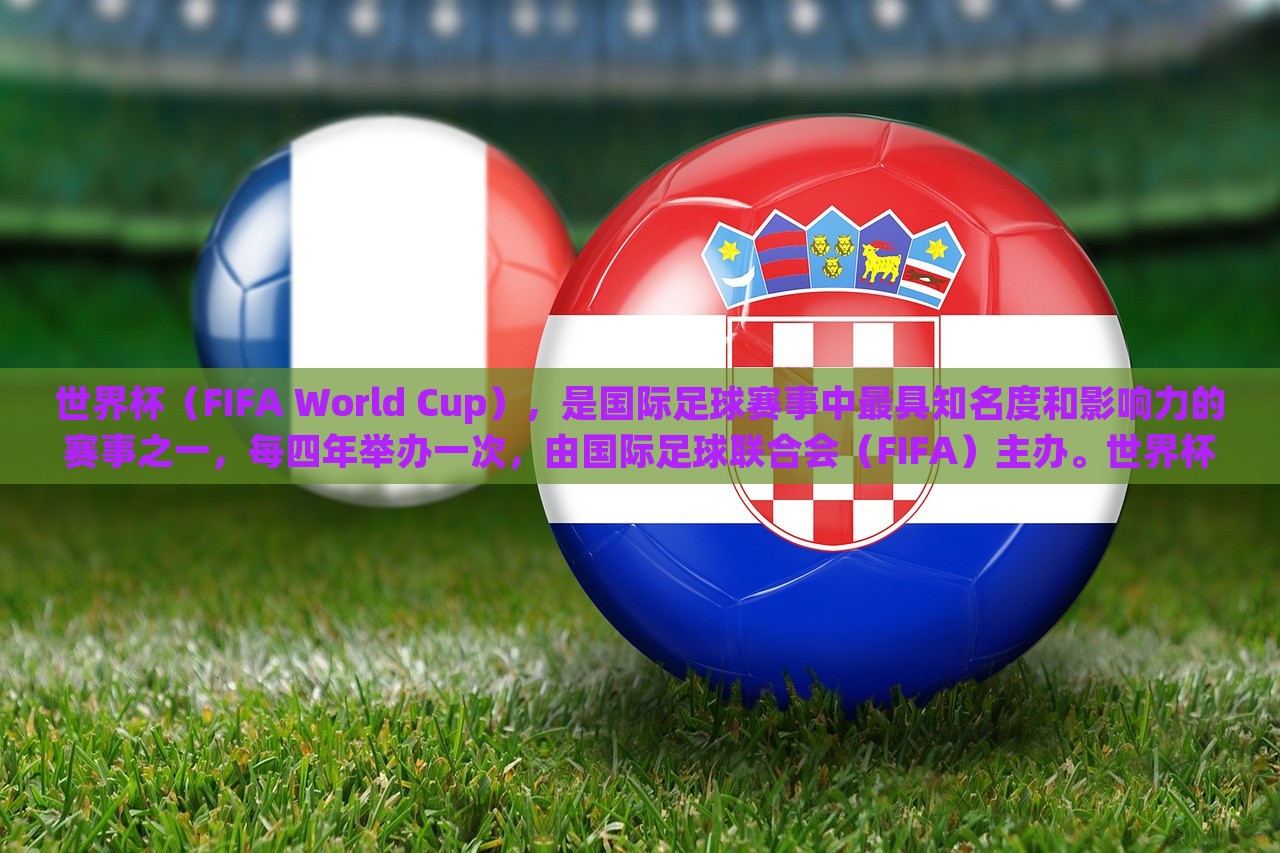 世界杯是由国际足球联合会主办的一项国际足球赛事,每四年举办一次,是全球最具知名度和影响力的足球比赛之一。世界杯旨在促进全球足球运动的发展,加强各国之间的交流与友谊。随着赛事规模和影响力的不断扩大,世界杯已经成为全球体育界最盛大的赛事之一。