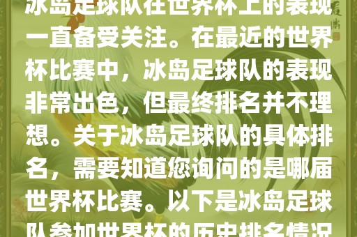 冰岛足球队在世界杯上的表现引人关注。尽管在最近的世界杯比赛中表现出色,但最终排名并不理想。关于其历史排名,需知道具体是哪届世界杯比赛。冰岛足球队在世界杯赛场上留下了深刻的足迹。