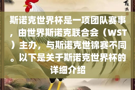 斯诺克世界杯是一项团队赛事,由世界斯诺克联合会(WST)主办,与斯诺克世锦赛不同。以下是关于斯诺克世界杯的详细介绍