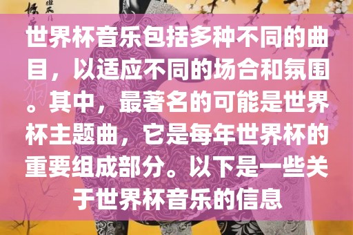 世界杯音乐包含多种曲目,适应不同场合和氛围。世界杯主题曲最为著名,是每年世界杯不可或缺的部分。这些音乐以激情、活力和庆祝为主题,为世界杯增添氛围和乐趣。摘要字数在100-200字之间。