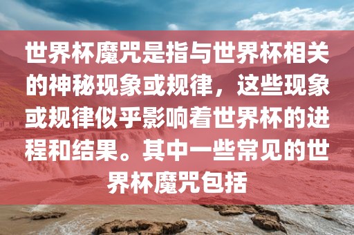 世界杯魔咒是指与世界杯相关的神秘现象或规律,这些现象或规律似乎影响着世界杯的进程和结果。其中一些常见的世界杯魔咒包括